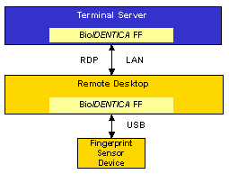Mit Hilfe nur eines Parameters lässt sich BioIDENTICA® FF problemlos auf Terminalserverbetrieb einstellen. Es stehen zwei Betriebsarten zur Verfügung. Mit USB-Sensorgeräten von UPEK und schneller LAN-Verbindung wird nur der Sensor am Client betrieben, der Rest läuft gesichert auf dem Server. Ist die verfügbare Verbindung langsam, kann die gesamte Fingerprinterkennung vom Server gesteuert auf dem Client ablaufen. Nur das Ergebnis muss übertragen werden. In dieser Betriebsart sind alle Sensoren einsetzbar!